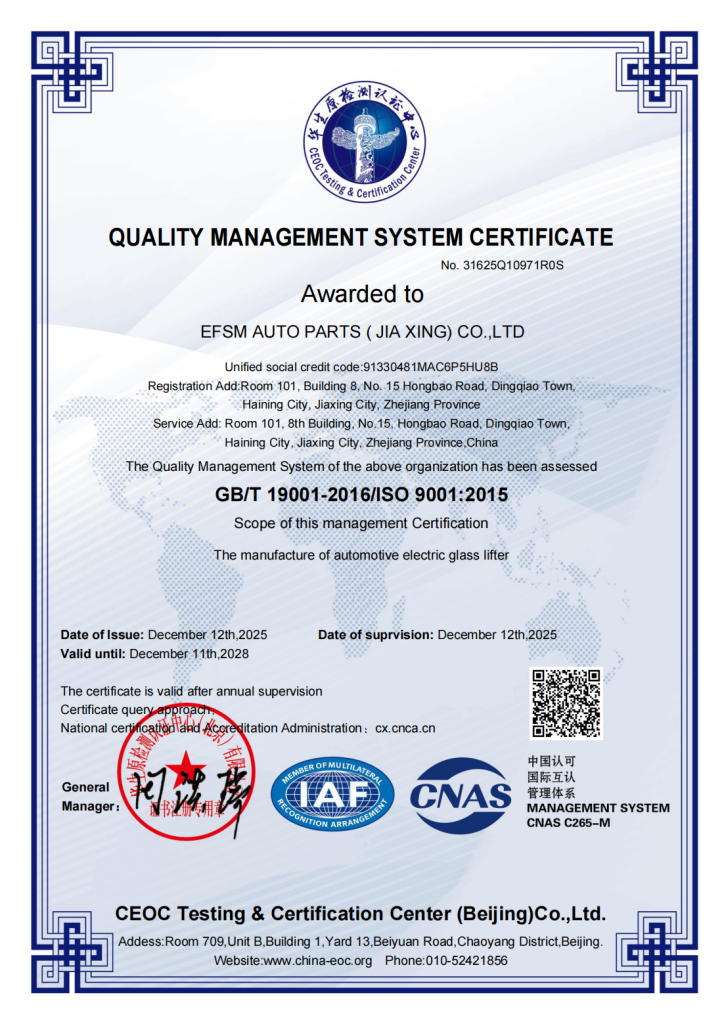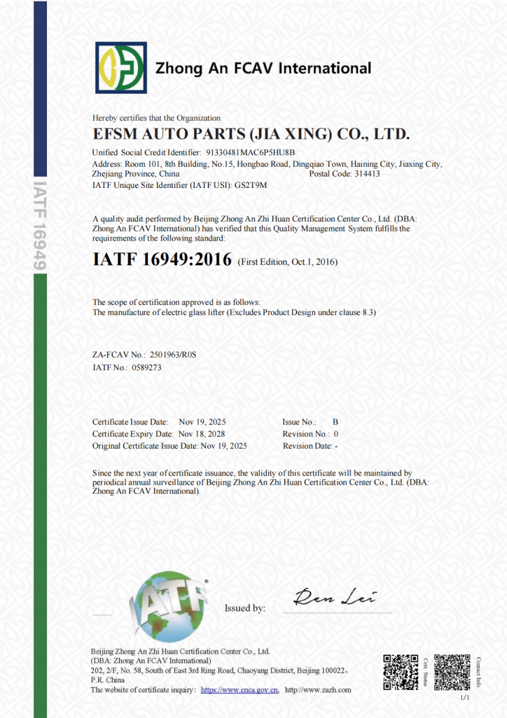 EFSM’s QMS encompasses all aspects of its window regulator assembly design, development, and manufacturing processes. By adhering to the rigorous requirements of IATF 16949:2016, EFSM demonstrates its commitment to: - Customer satisfaction: Meeting or exceeding customer expectations for product quality, reliability, and performance.